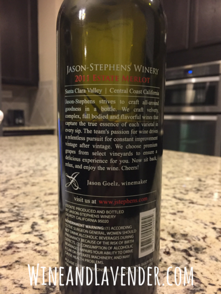 The Label: “We craft velvety, complex, full bodied and flavorful wines that capture the true essence of each varietal in every sip.” I whole-heartedly agree. This velvety wine was very enjoyable. I decided to look them up to see what other wines they make that I could test. In doing so, I found their description for the Estate Merlot: Tasting Notes by Jason Stevens Winery: